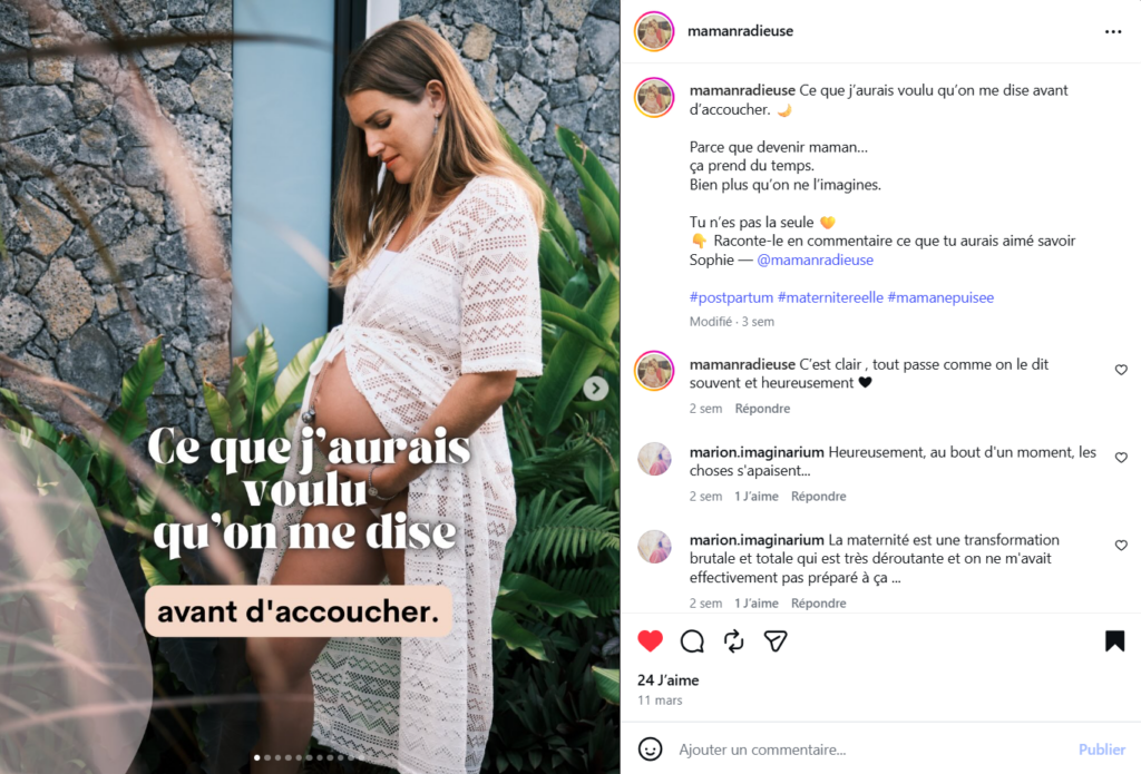 Aujourd’hui, à travers mon compte @mamanradieuse, ma mission est d’offrir ce soutien aux mamans pour qu’elles retrouvent confiance en elles, loin des injonctions de perfection.